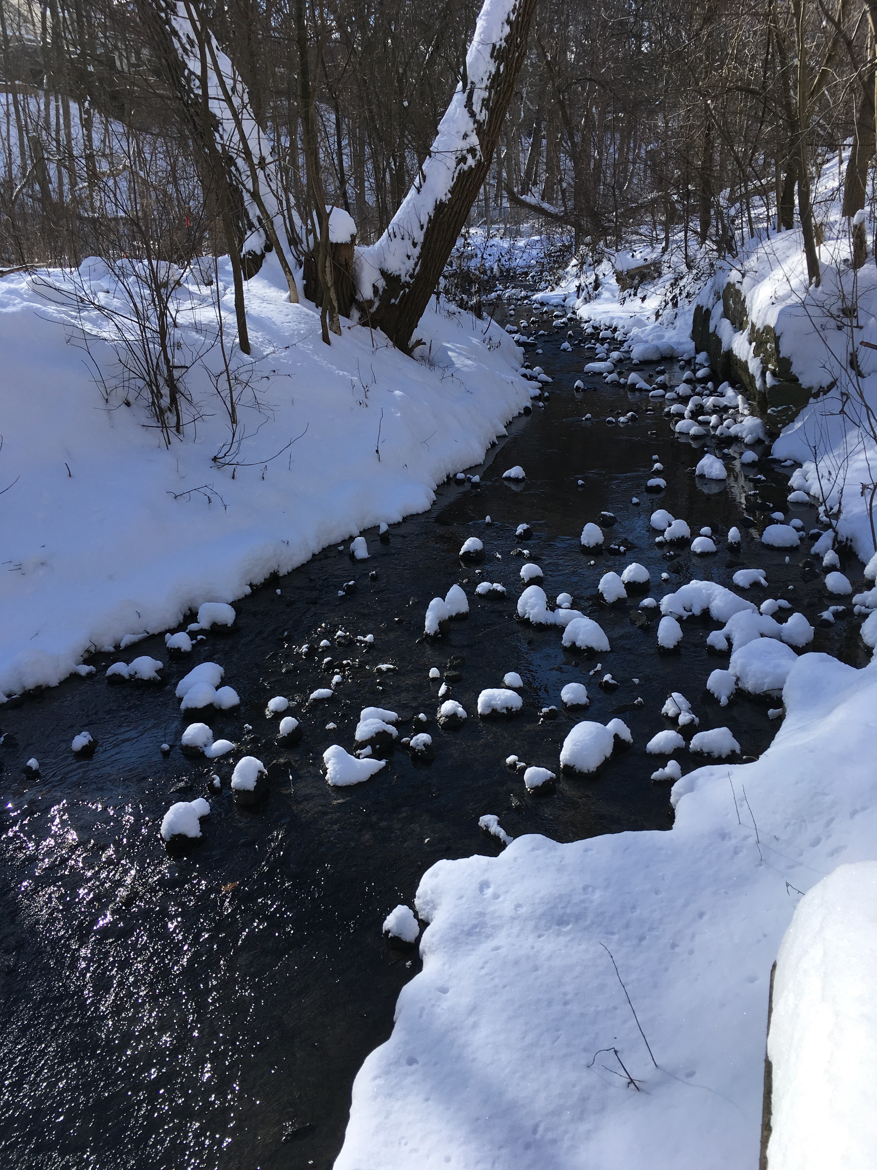 As I followed the trail through the ravine, I could hear the sounds of digging out – the scrape of snow shovels and the hum of snow blowers. There is also a small creek flowing through the park (Burke’s Brook) and it hadn’t frozen over so there was the ripple and splash of that as well.