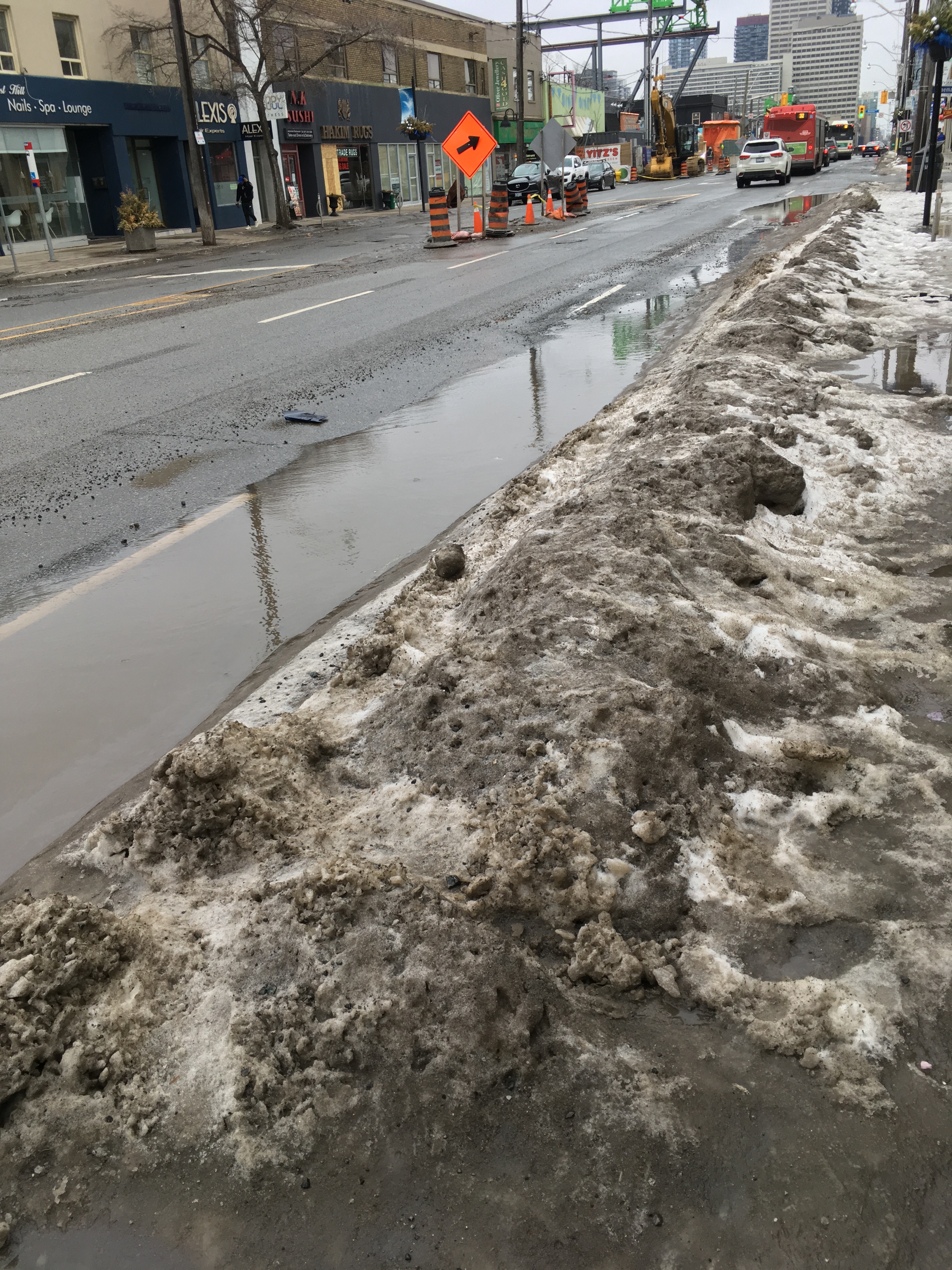 March also means walking is depressing and cheering at the same time. Depressing because the melt-off reveals the crud and garbage that has been hidden in snow banks, and the snow by the roads has become grey-black ice – the result of accumulated car exhaust that makes you realize you’re breathing that in as you walk.
