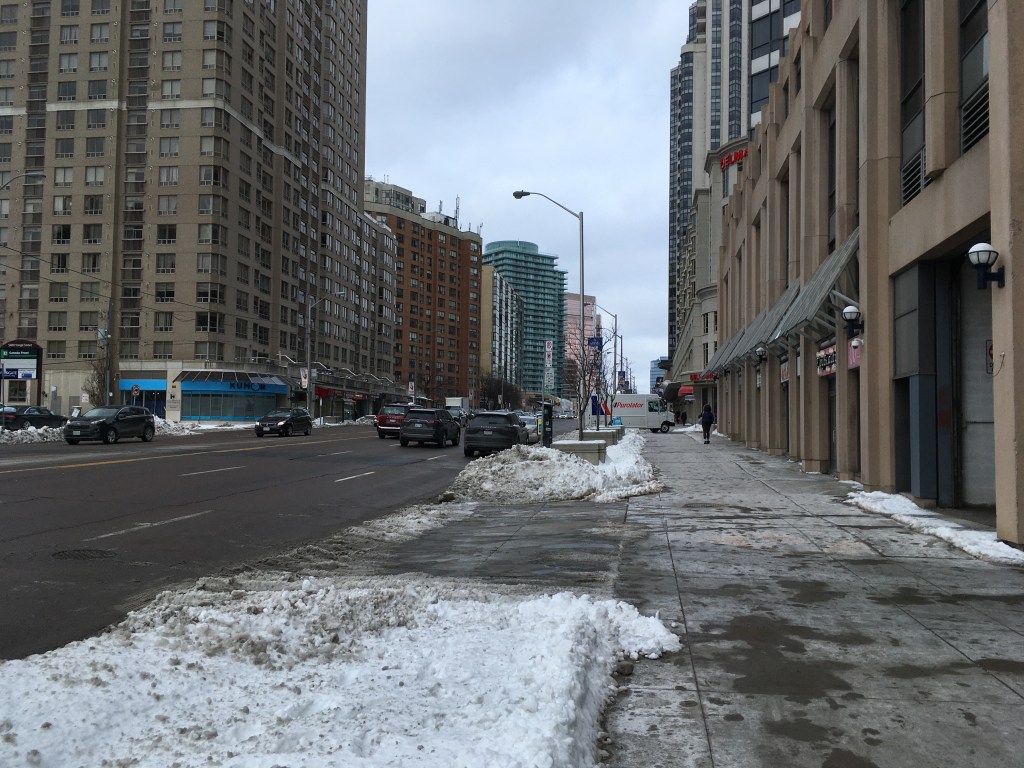 And maybe I should also call it a hangover from walking TO Streets over the past few weeks. My sinuses have been clogged and I’ve had a mild headache for days, since I finished walking Yonge Street and Eglinton Avenue. I don’t know if it’s the weather or just the pollution and gunge in the air. It does seem worse in winter, when damp heavy air seems to hold the dust and traffic exhaust and create a grimy blanket that you have to breath as you walk along these streets.