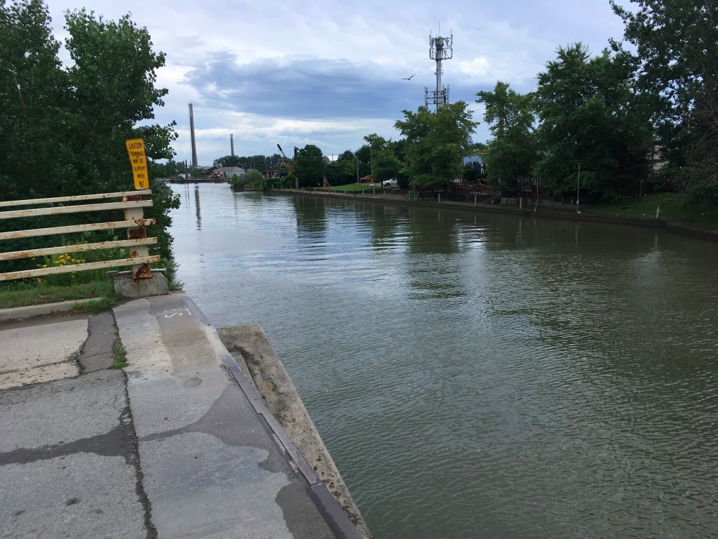 Once on the trail here, follow it west for about 4 km to reach the lower Don parklands. At the Lower Don off-leash dog park, turn right (north) and follow the trail north and then west crossing under the Don Valley Parkway to reach the junction with the Don Valley Trail system. Turn right (north) crossing the Don River over the old Don Mills Road bridge,