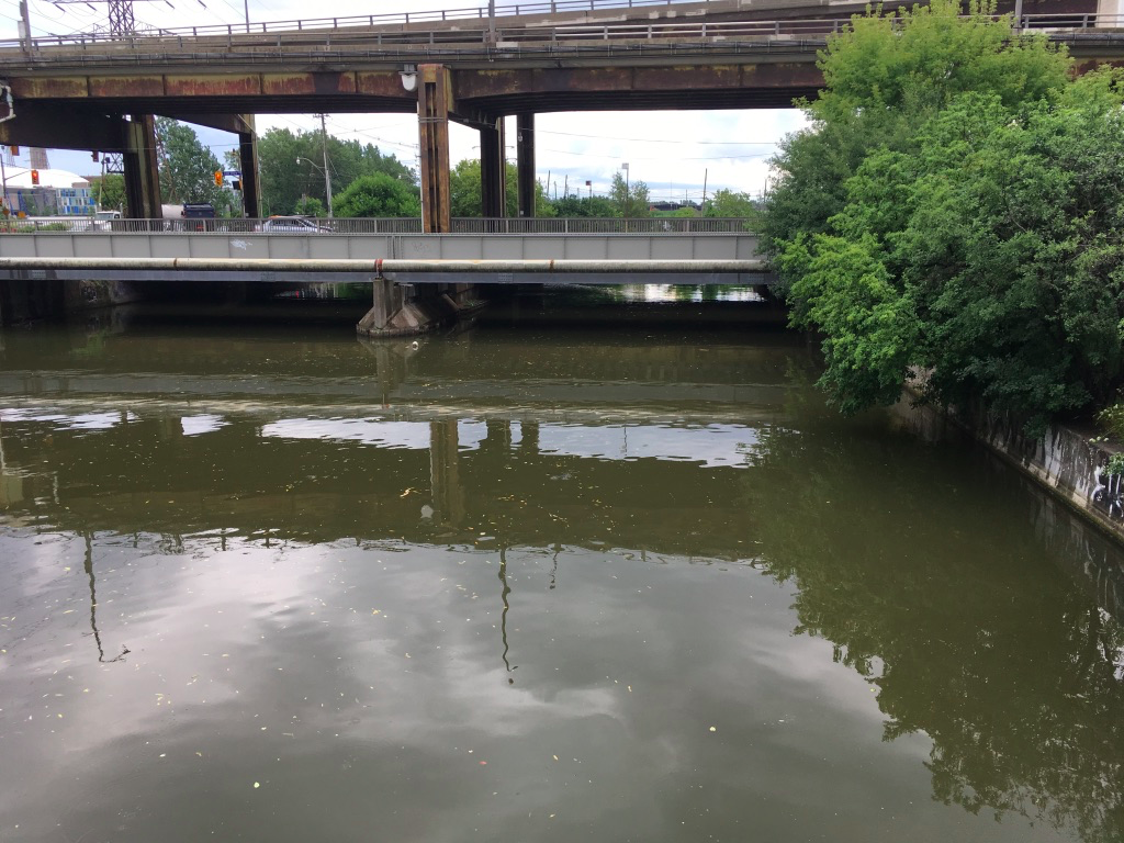 If you go past the Common, the Trail bends a bit west and then east under the Don Valley Parkway overpass, to come to a trail junction. Turn left (east) here to cross the Don River and then join the Martin Goodman Trail parallel to Lakeshore Blvd. If you detoured into the Common, follow the paths in the park back out through the junction tunnel that passes under the train tracks to rejoin the Lower Don Trail.