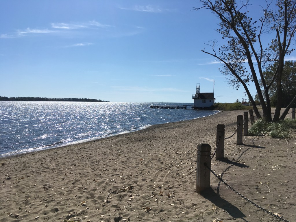 At the bottom of Cherry Street, you come to an unexpected little treasure – Cherry Street Beach park. The view across the water to the south is of Tommy Thompson park and looking west you get a view out past the Toronto Islands to the lake.