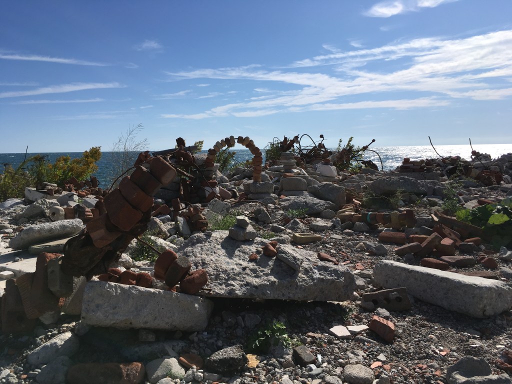 Below the lighthouse, there isn’t a beach as such – instead the reclaimed nature of the park is on display. The whole of the park is based on excavated soil and construction debris that came from the gradual development of the buildings that now form the Toronto skyline. Over the years this landfill has supported the growth of plants that have transformed the old Leslie Street Spit into the new Tommy Thompson park. The underlying concrete and bricks on display at the lake-facing side of the tip have been used by artists to create sculptures that cover the area.