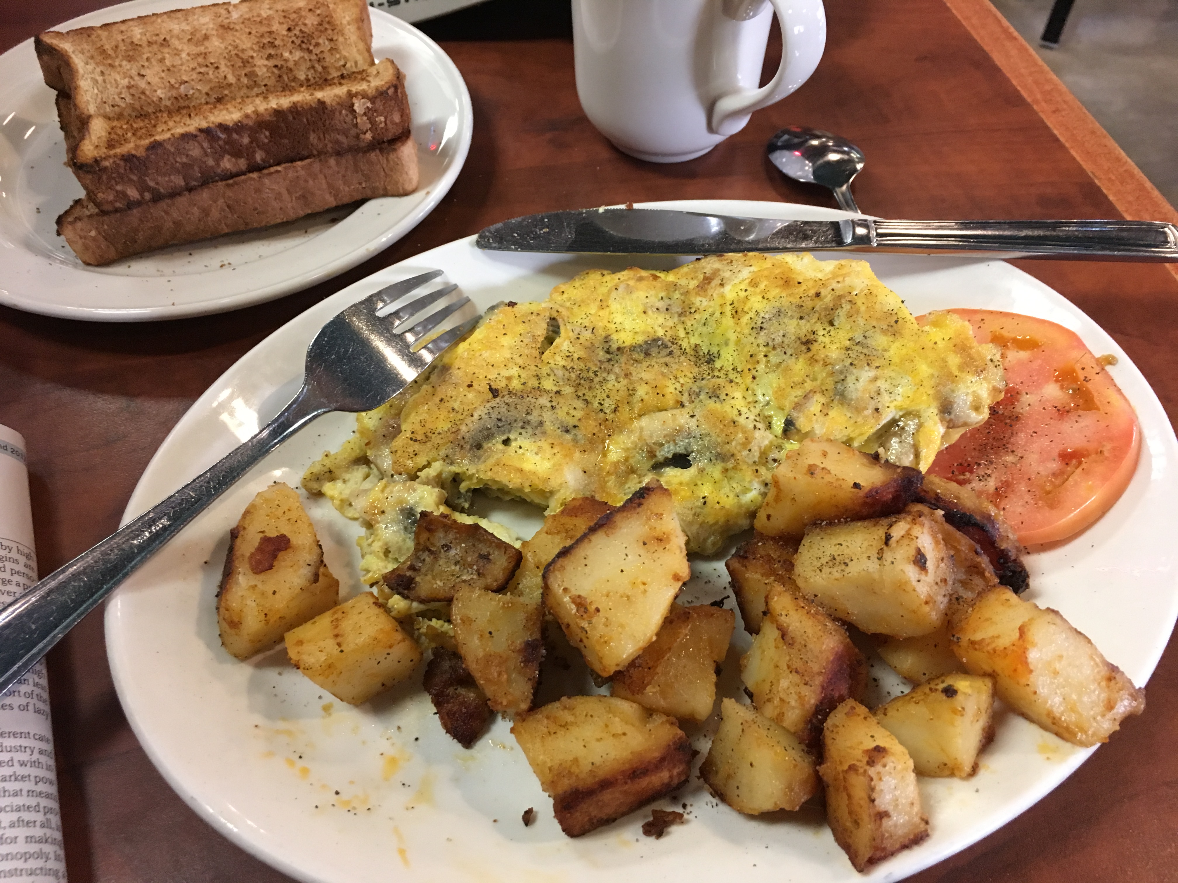 The mushroom omelette with home fries and toast (and don’t forget the token tomato!) – yummm!